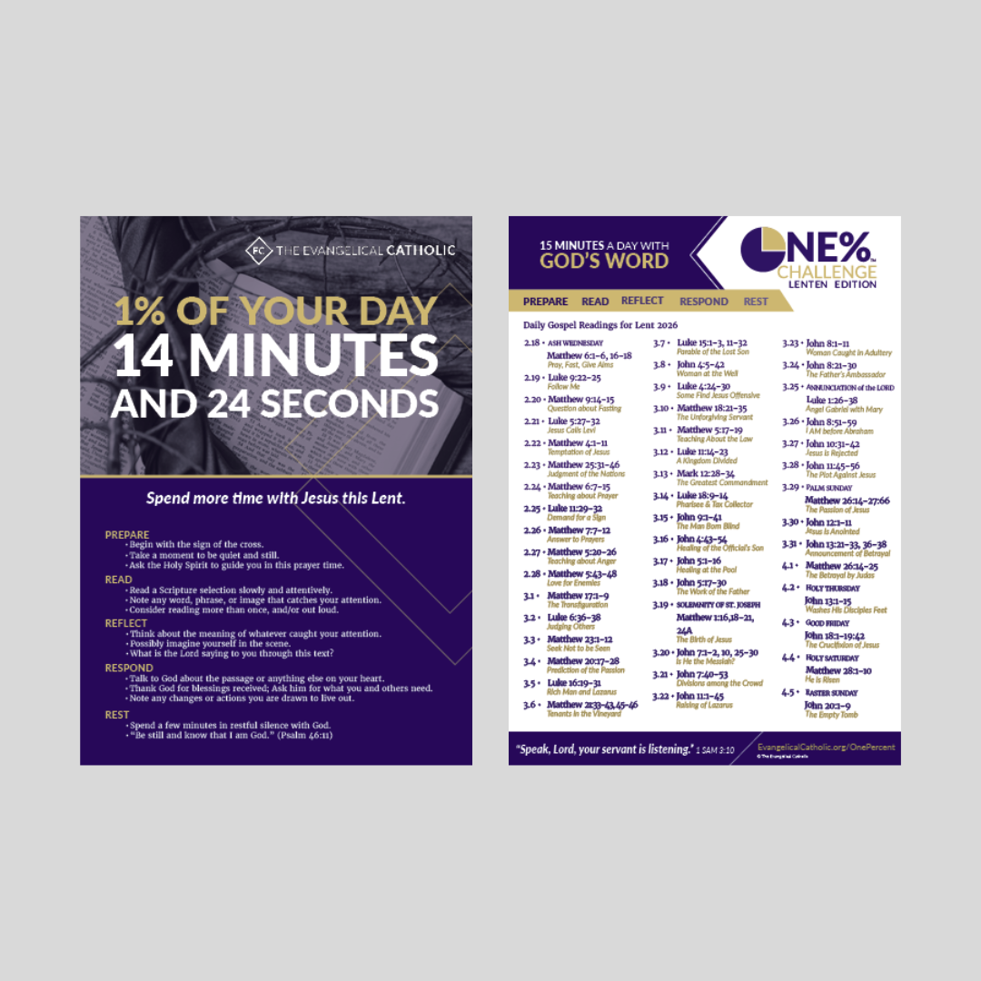 Our 1% Challenge resources guide you to use the saint-recommended way of reading Scripture, lectio divina (divine reading): Read, Reflect, Respond, & Rest. Fifteen minutes a day with the word of God changes lives!