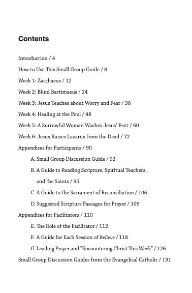 The six sessions in Believe: Meeting Jesus in the Scriptures focus on episodes when Jesus changed people's lives. The questions that follow are designed to spark discussion and allow each person to consider how the story applies to his or her own life. Weekly spiritual exercises between sessions help participants meet Christ in both prayer and the sacraments. Also included are detailed "how-to" guides for both facilitators and participants.